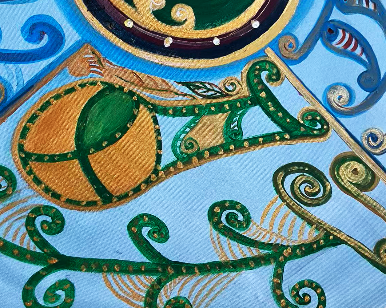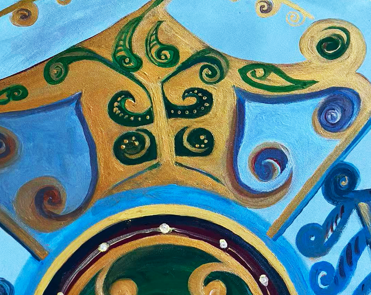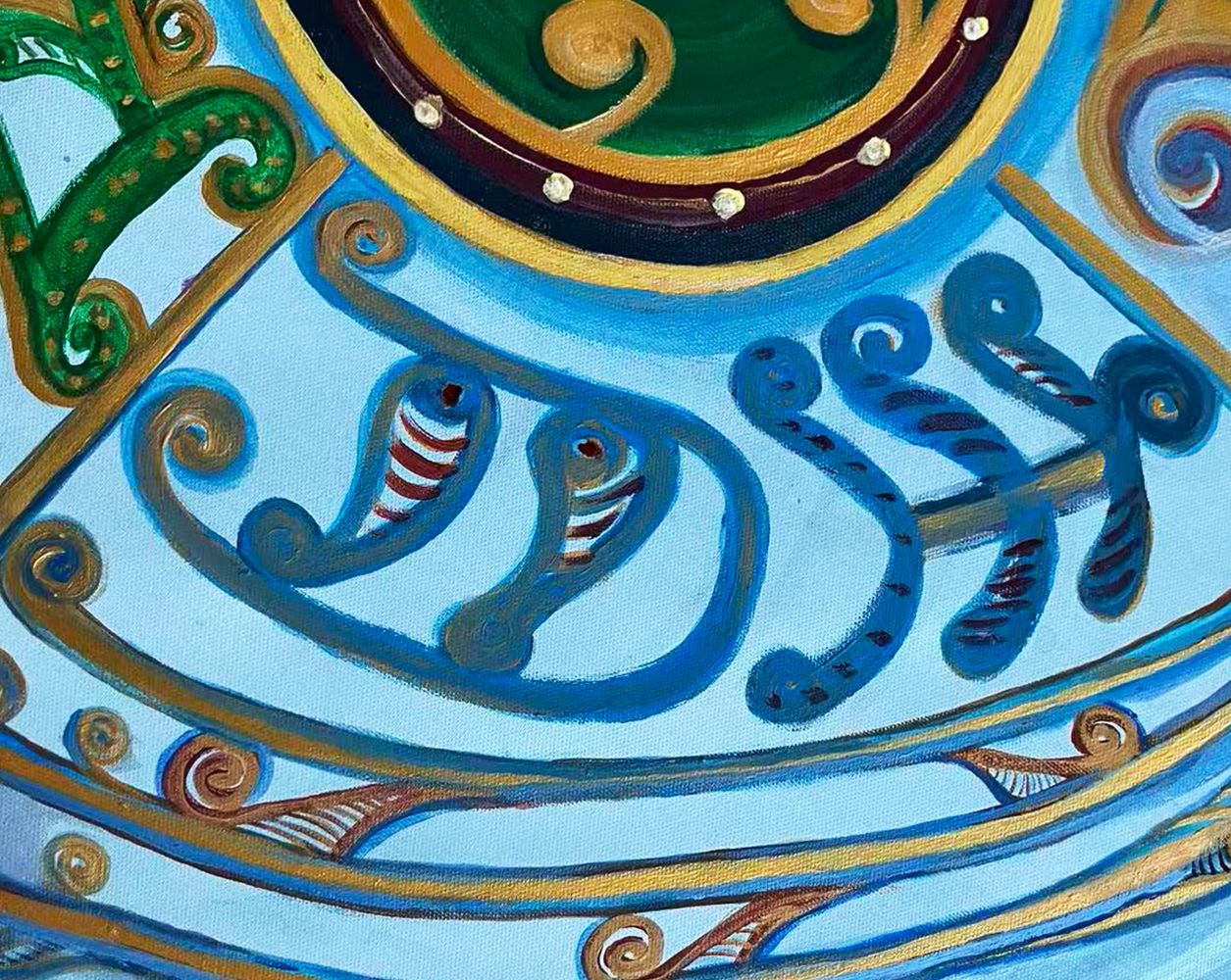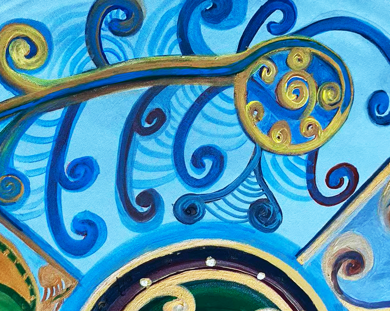 心明调动他的文字学、金石书画学的功底,结合南太平洋毛利文化吉祥价值观,在圆形画布空间,利用汉瓦当的巧思把文字上升为一个个形象鲜明的画面。,例如”清”字 的世界像蓝天那样安详,利用丙烯加矿物的青蓝色就着圆形 调整左右结构 使螺旋气场的线条初定 。”福”的艺术语言着重在田里用金镶玉的色调示现人间福禄从天而降。蓝色依然牵引其中。”齐”就像一座心灵的归宿,金黄的宫殿。””天”的形象就更夸张于千手千眼,全以自在的蓝色深浅调和,揭示新西兰蕨树无尽的生生不息寓意。如果说西方绘画在色调调配充满秩序和理性的,那么中国书画艺术的笔墨功夫在于体势的调整和调配出他的韵致。整幅作品在用笔和色彩贯穿中国哲学五行价值观。以相生的理性超越西方用色的法度。以大吉祥庇佑天下享清福齐天的有情众生。